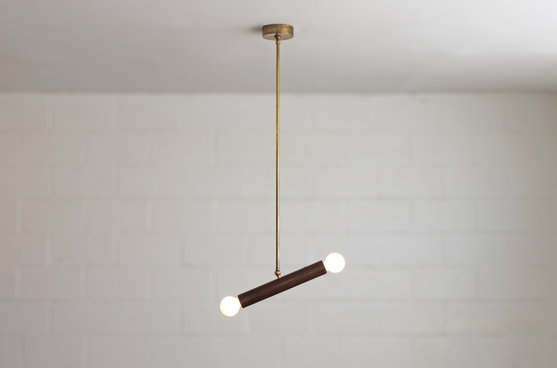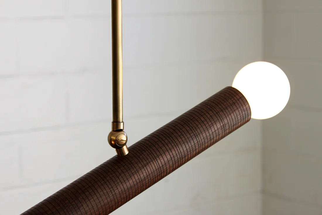 An etched walnut cylinder pivots to the brass for a perpendicular or asymmetric form.